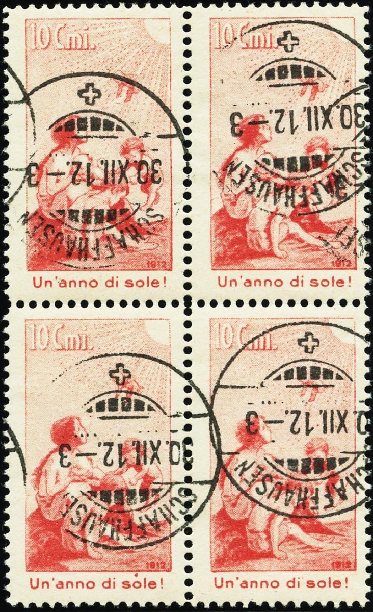 Un autentico precursore italiano annullato in un blocco di quattro, è una delle grandi rarità filateliche. Prezzo di catalogo minimo CHF 28.000,00.