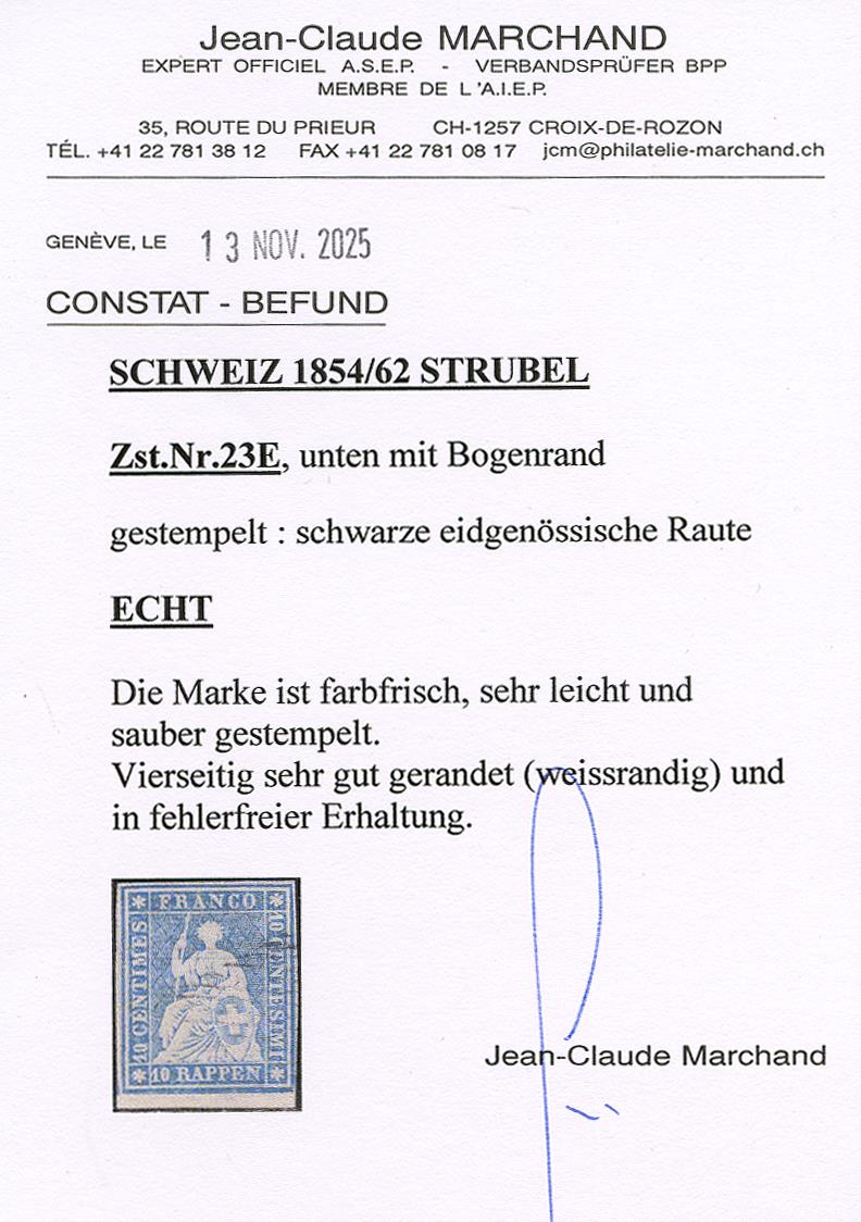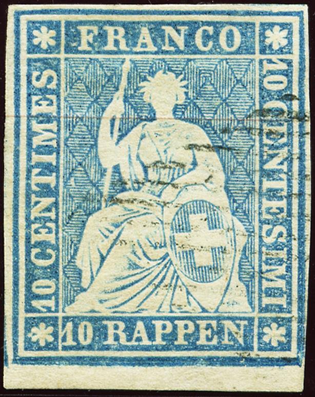 Timbre Strubel éclatant et net, à marges blanches sur tous les côtés et à bord inférieur festonné. Timbre rare et d'une beauté exceptionnelle, en parfait état.
