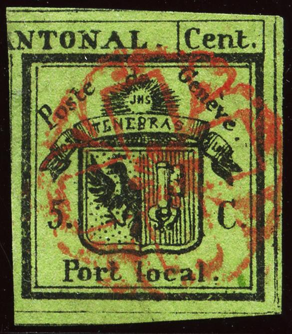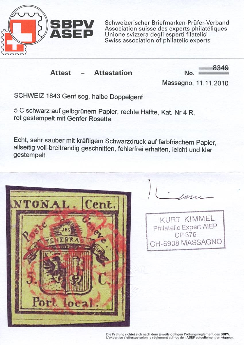 A clean and fresh-colored example, with very good margins on all sides. The stamp is discreetly and cleanly postmarked with a Geneva rosette in the center. This right half of the Double Geneva is in impeccable and flawless condition. A very rare and valuable stamp.
