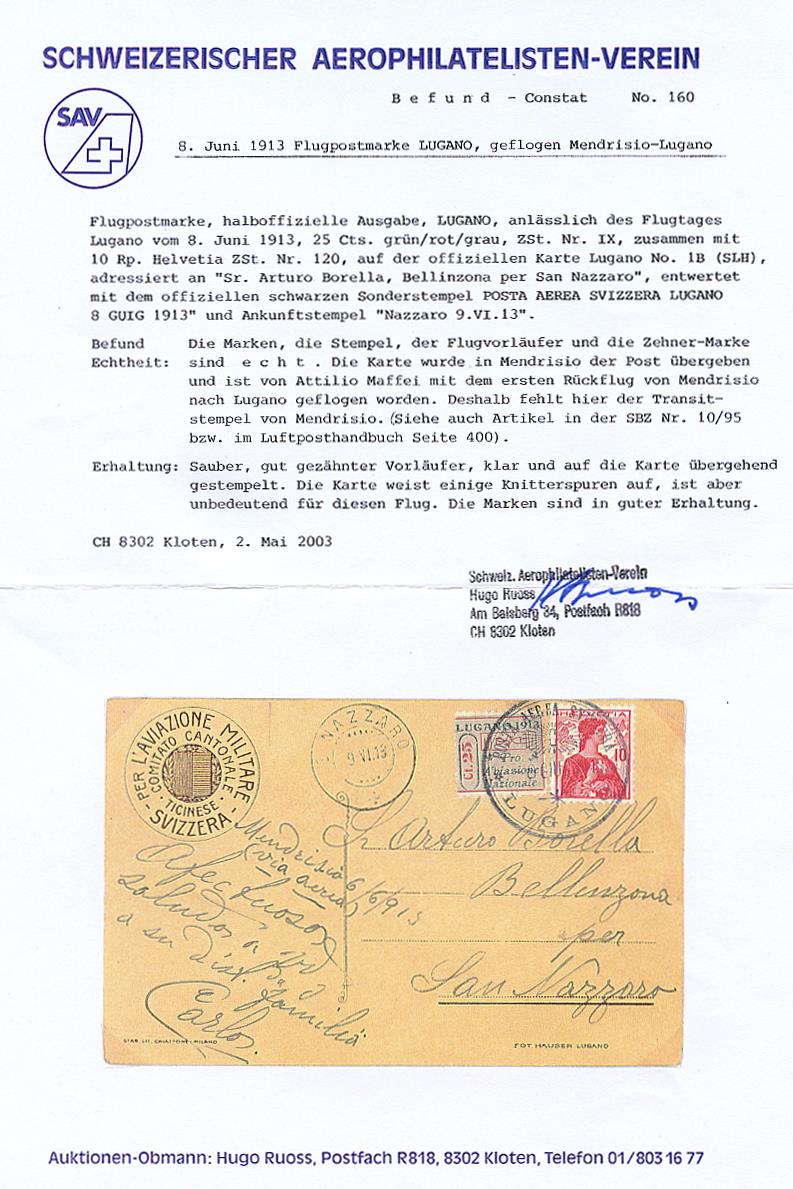 Stamped with special postmark POSTA AÉREA SVIZZERA 8 GIUG 1913 - LUGANO