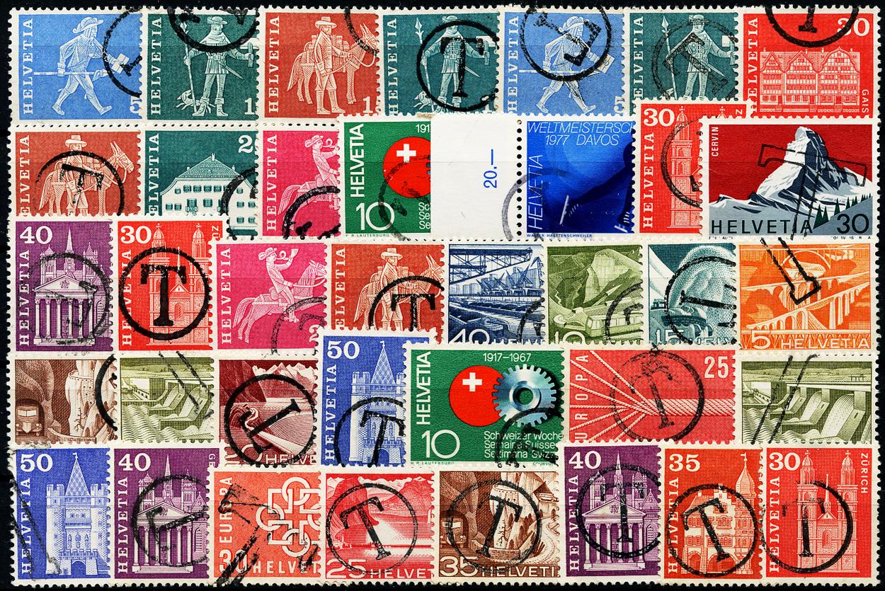 Umfangreiches Strafporto-Stempel Lot mit insgesamt 70 Stücken auf zwei grossen Steckkarten. Allesamt sind mit dem rund eingefasstem oder dem grossem Strafporto Stempel T entwertet. Dieses Stempel-Set befindet sich in guter und sauberer Erhaltung.