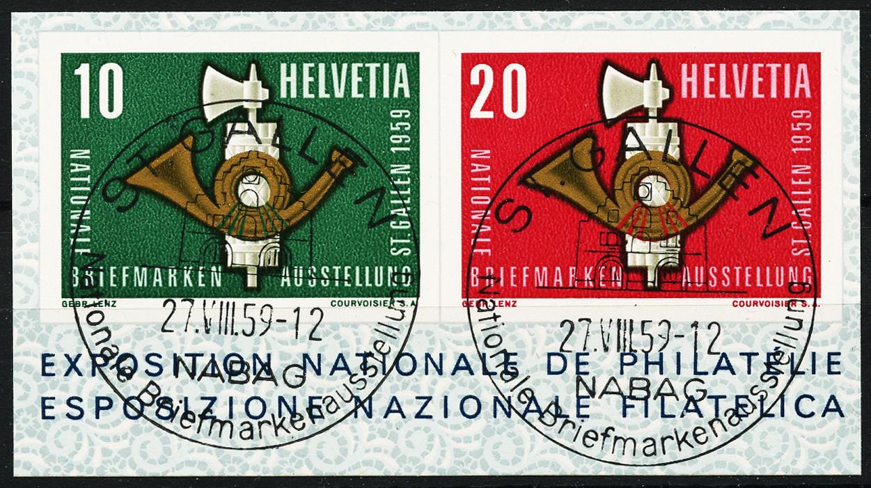 1959, Einzelwerte aus Gedenkblock zur nationalen Briefmarkenausstellung in St. Gallen