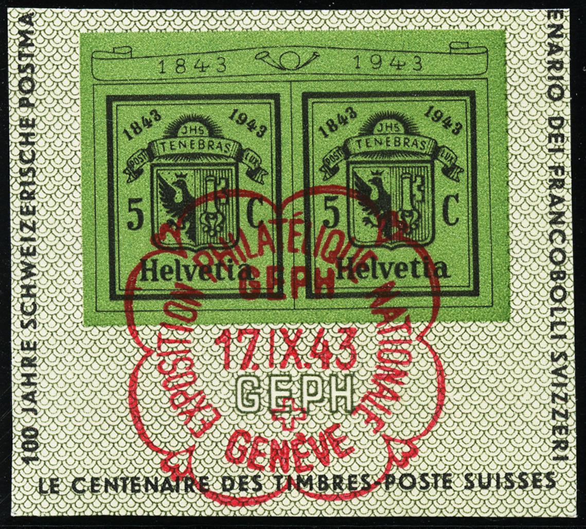 1943, Einzelwerte aus Gedenkblock zur Nationalen Briefmarkenausstellung in Genf