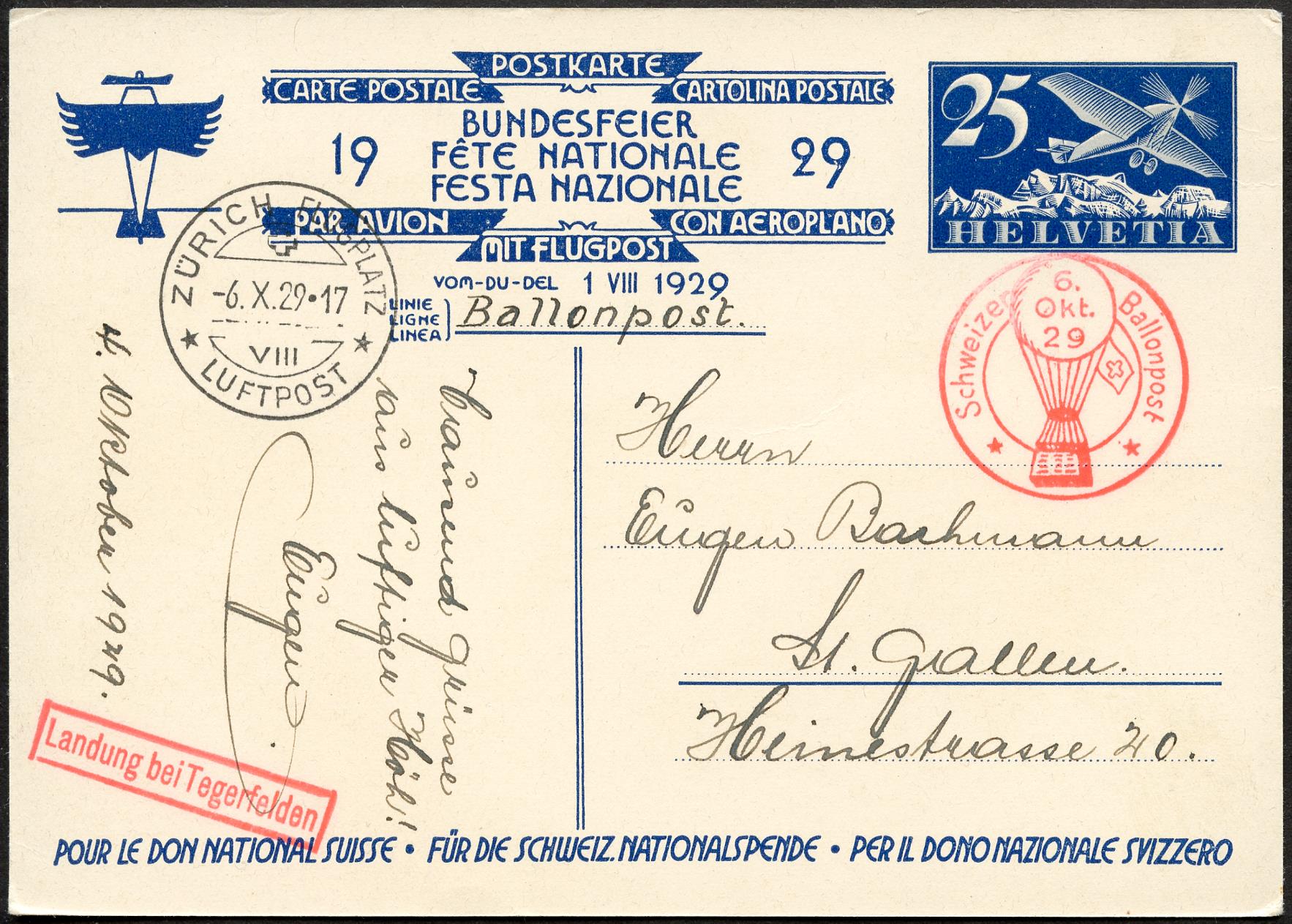 Gestempelt mit SCHWEIZ. BALLONPOST und ZÜRICH FLUGPLATZ -6.X.29-17 VIII LUFTPOST