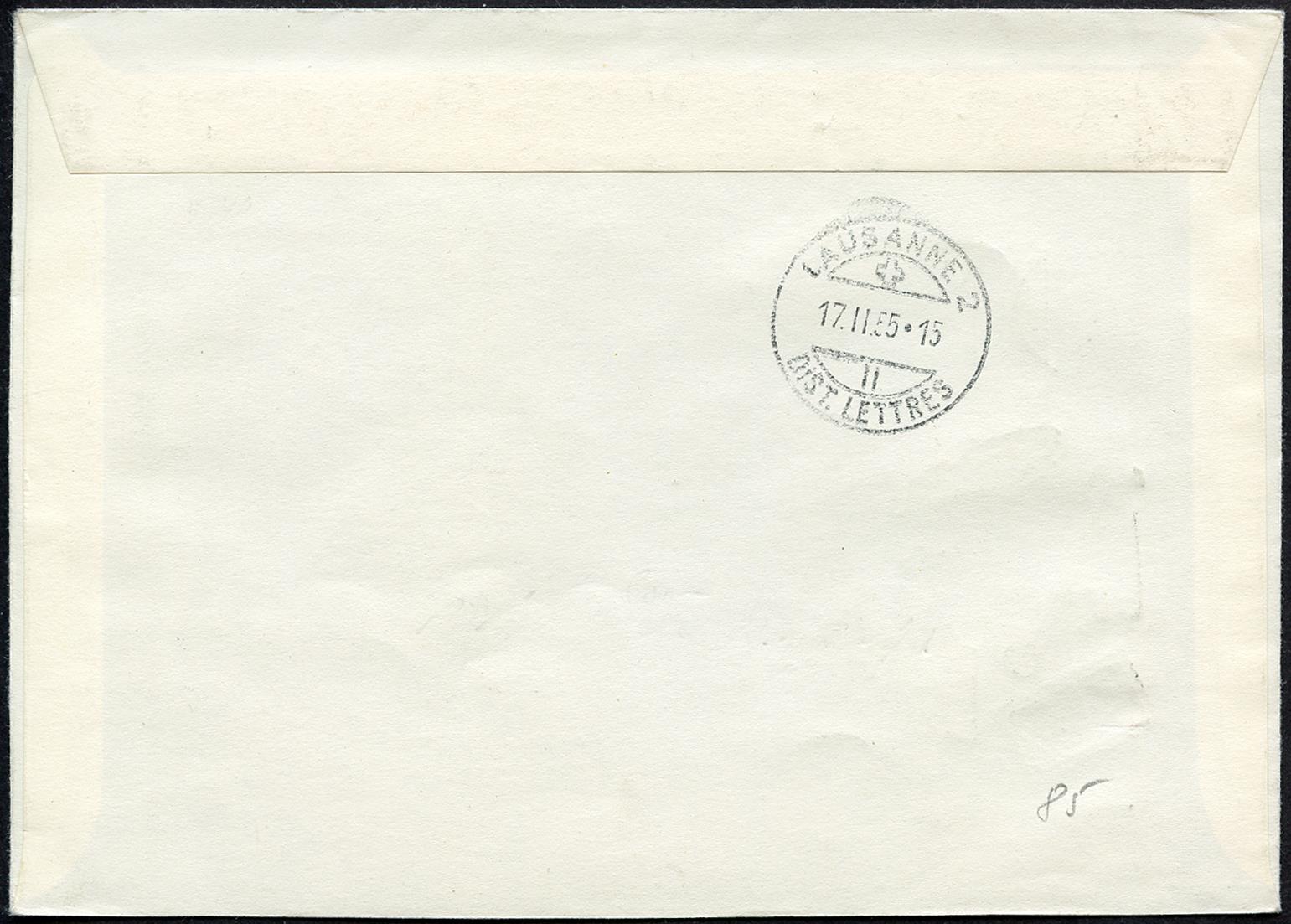 A beautiful FDC addressed to Henry Raedler in Lausanne. The postage is vibrant, perfectly perforated, and nicely cancelled. The FDC, with an arrival postmark on the reverse, is in good condition.