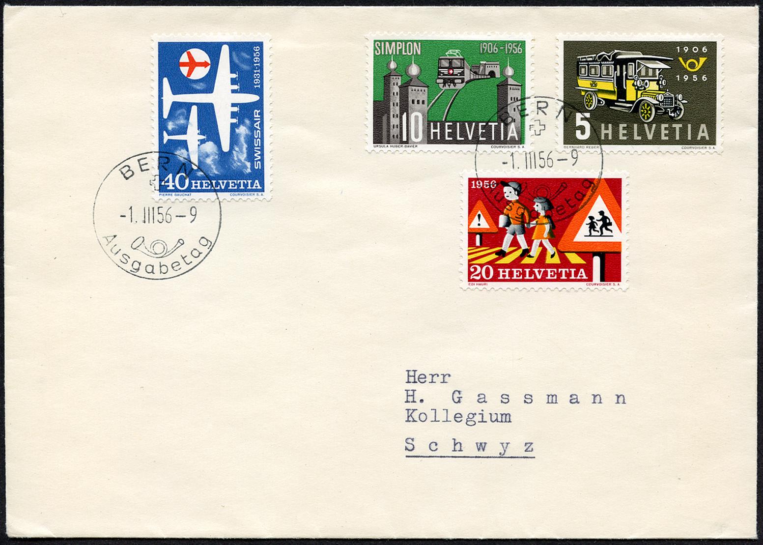 Une enveloppe premier jour (FDC) en excellent état, transportée de Berne à Schwyz. Les timbres perforés, fraîchement coloriés et intacts, sont parfaitement conservés et portent un cachet postal net.