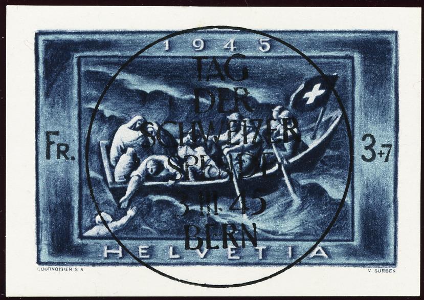 Gestempelt mit TAG DER SCHWEIZER SPENDE 3.III.45 BERN (PÉN Nr. 250)
