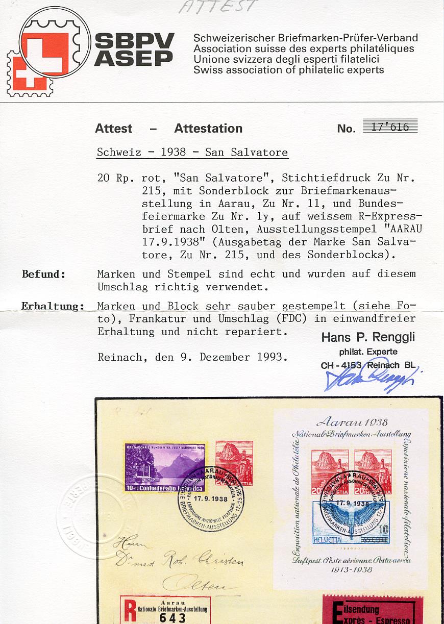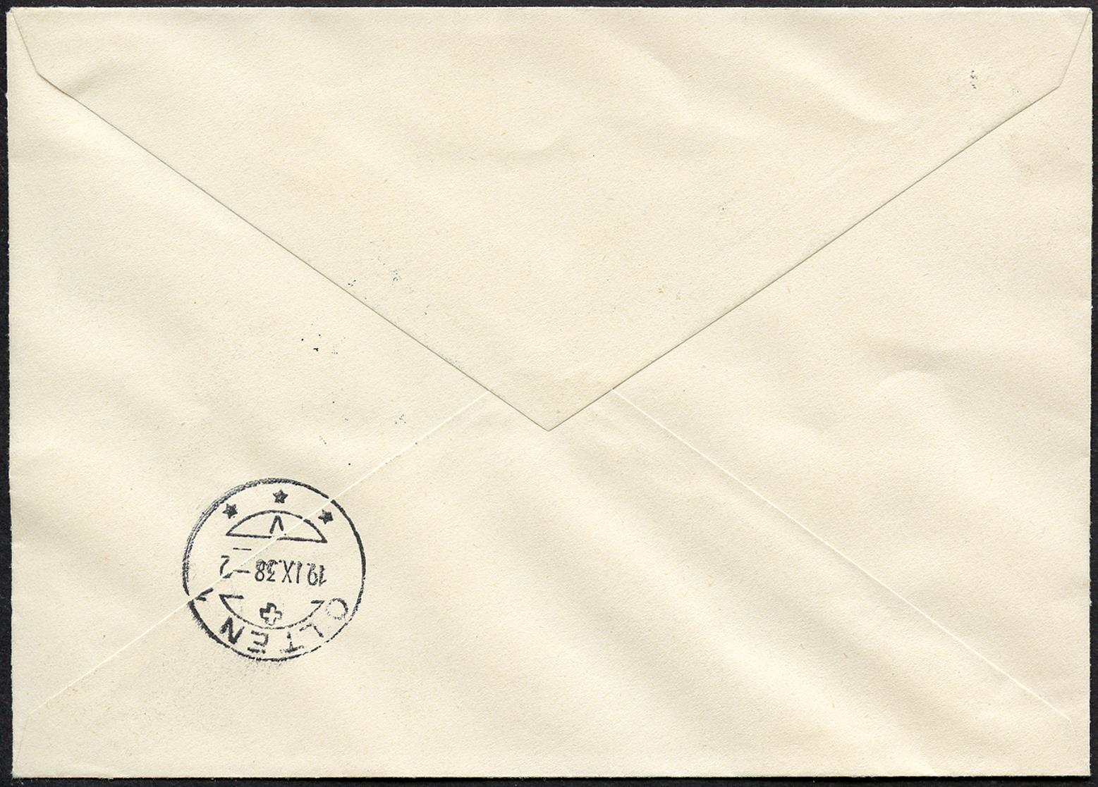 Ein ausserordentlich schöner FDC, adressiert an Herrn Christen in Olten und mit eingeschriebener Post zugestellt. Rückseite Ankunftstempel OLTEN 1 19.IX.38-2. Die Frankatur ist farbenkräftig, tadellos gezähnt und einwandfrei erhalten. Der Sonderstempel ist zudem sauber und klar aufgesetzt.