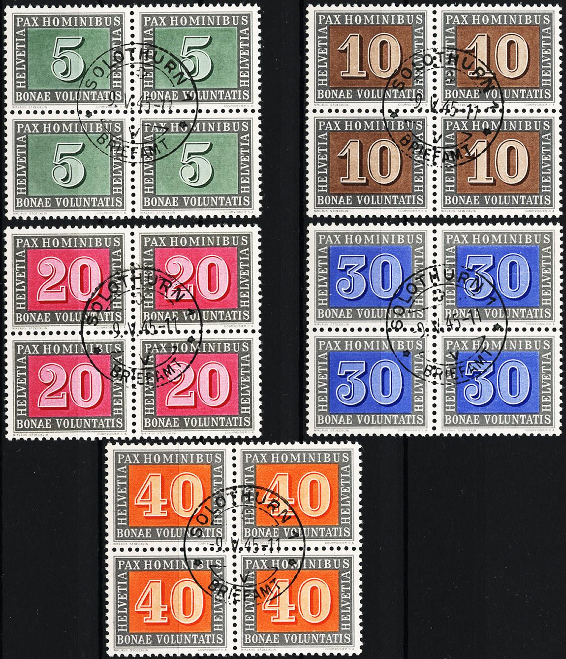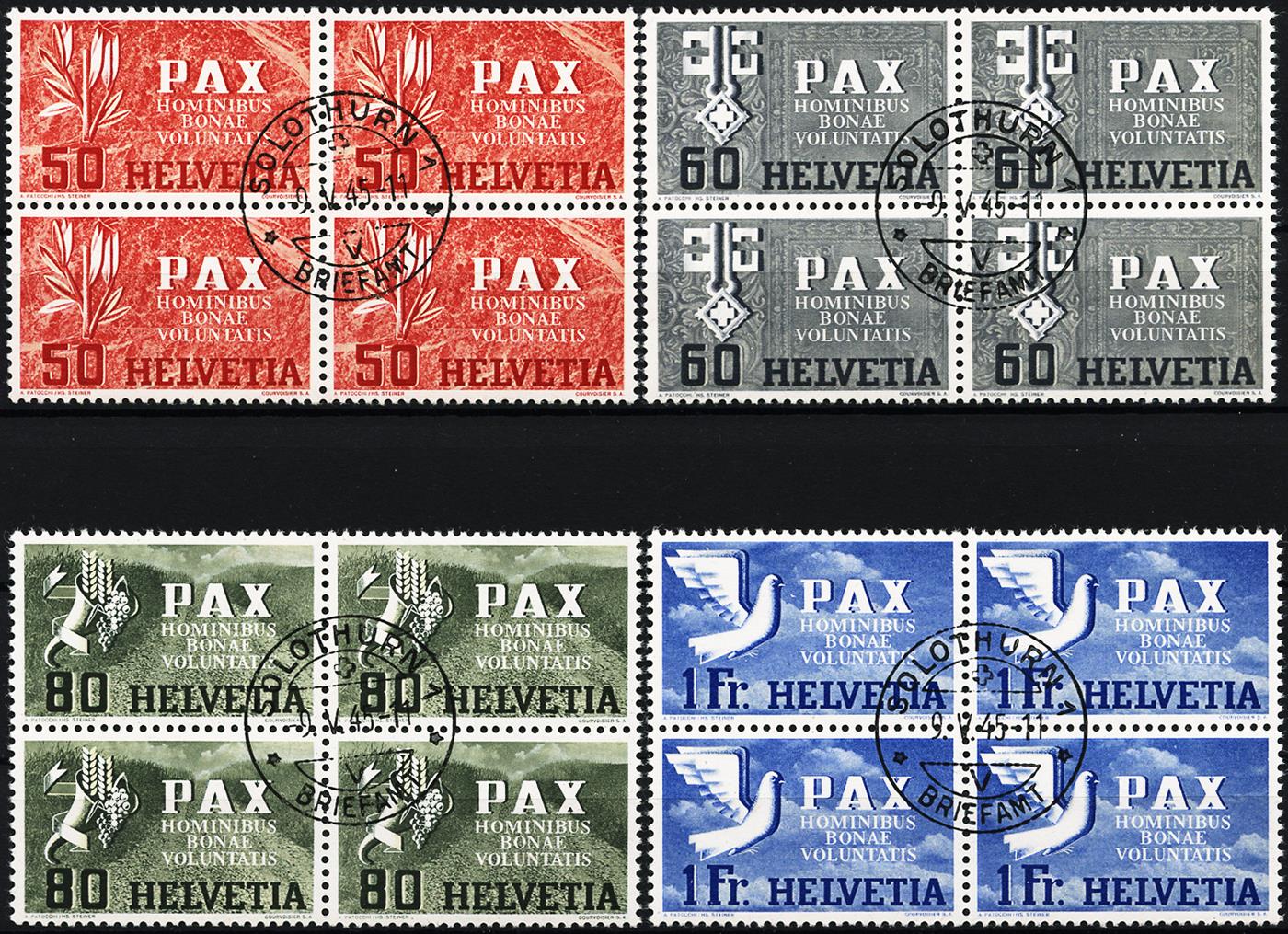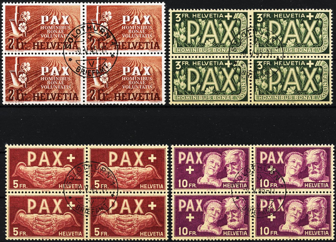 Kompletter Pax Satz im Viererblock mit Ersttagsentwertung. Alle Viererblöcke sind farbenfrisch, einwandfrei gezähnt und im Zentrum jeweils sauber und gleichmässig entwertet. Die ganze Serie hat Originalgummi und ist in absolut einwandfreier Erhaltung.