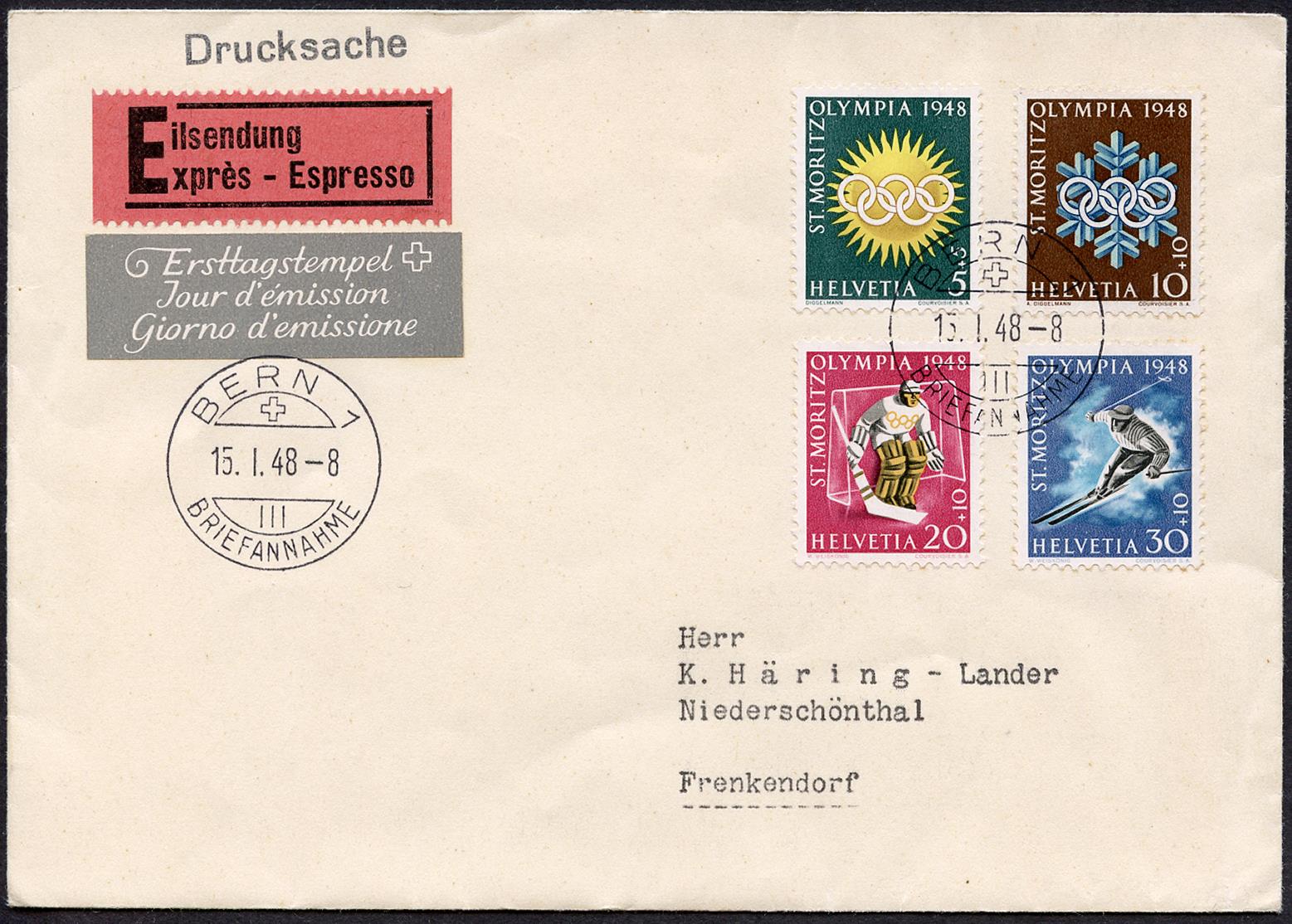 Ersttagsstempel BERN 15.I.48-8 III BRIEFANNAHME