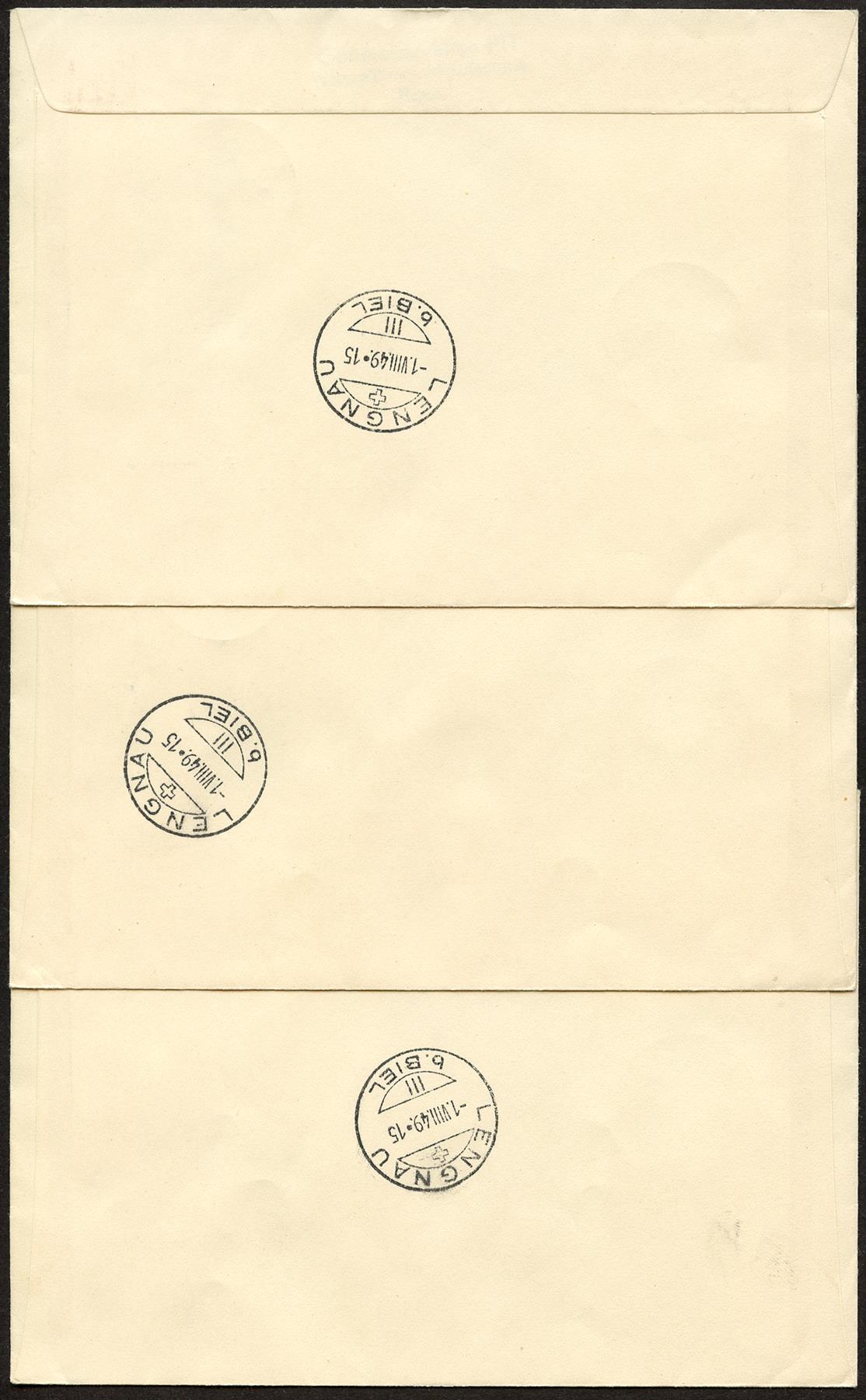 Trois magnifiques enveloppes premier jour (FDC) en parfait état, adressées à Hans Renfer à Lengnau. Les timbres sont bien disposés, parfaitement perforés et en excellent état. Tous les cachets postaux sont nets et précis. Ces enveloppes ont été distribuées par abonnement et comportent des cachets postaux de dates d'émission variées, en allemand, en français et en italien.