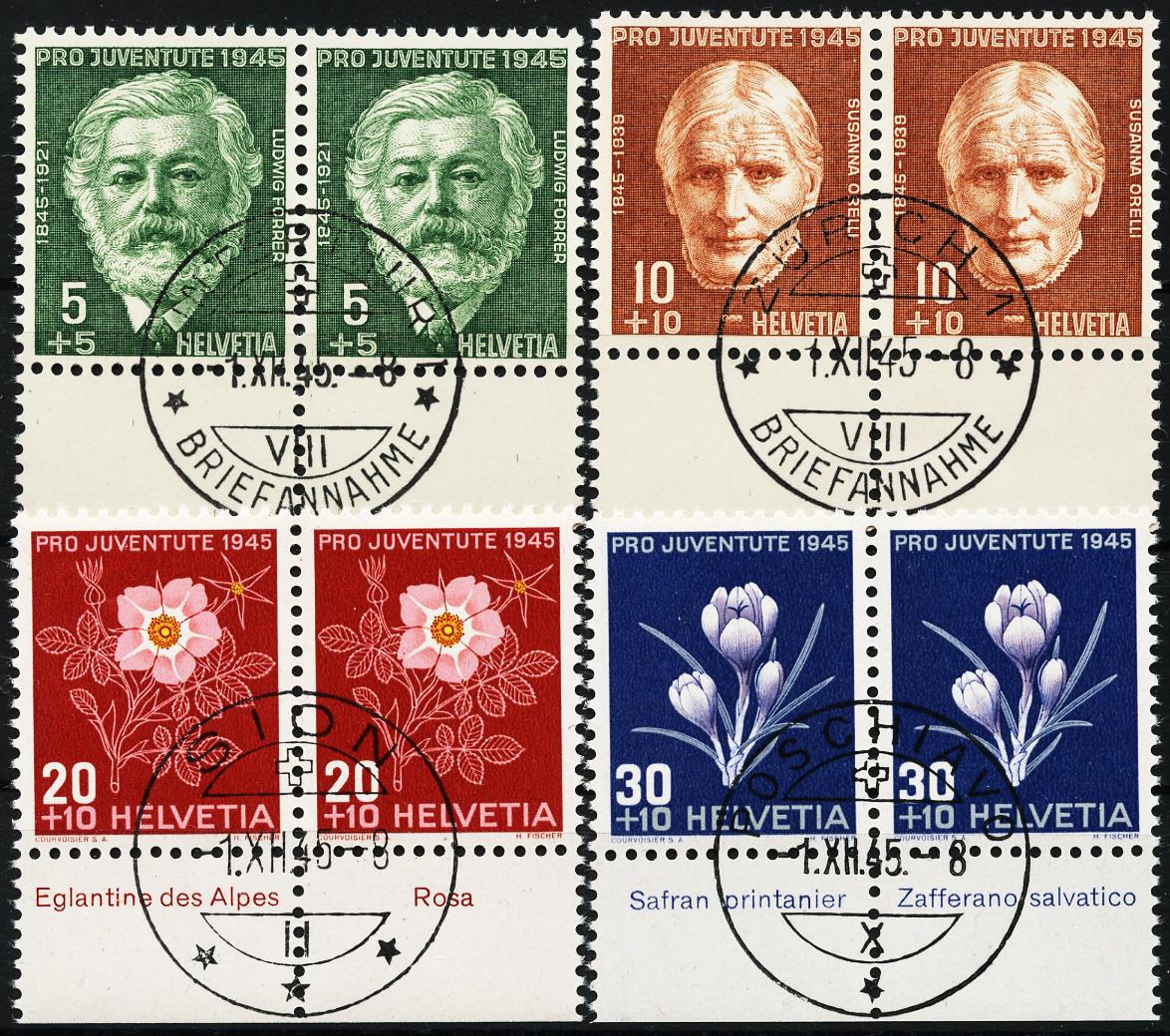Francobollo del primo giorno di emissione WINTERTHUR 1.XII.45-8 BRIEFANNAHME, ZÜRICH 1 1.XII.45-8 BRIEFANNAHME, SION 1.XII.45-8 und POSCHIAVO 1.XII.45-8