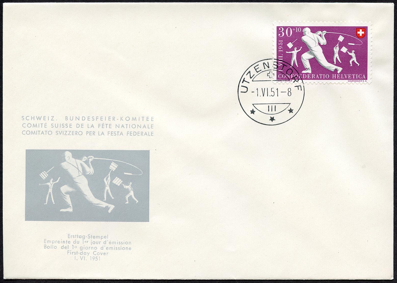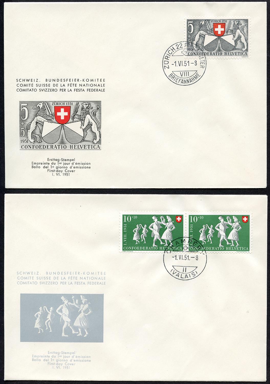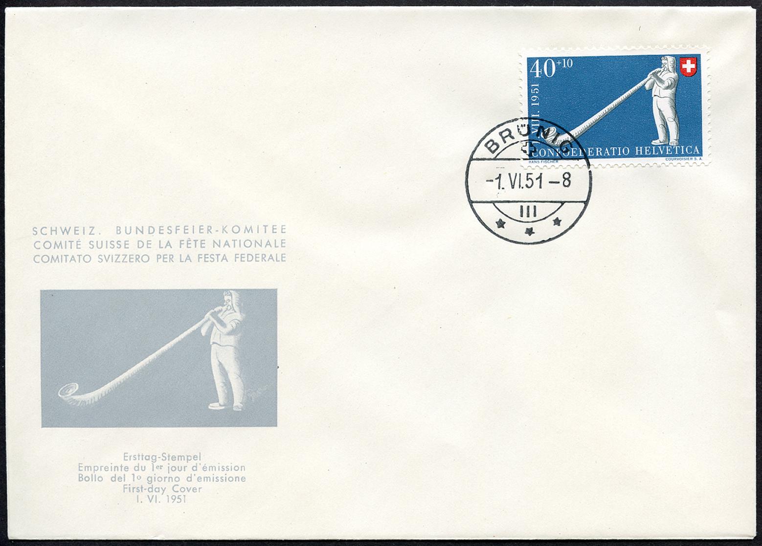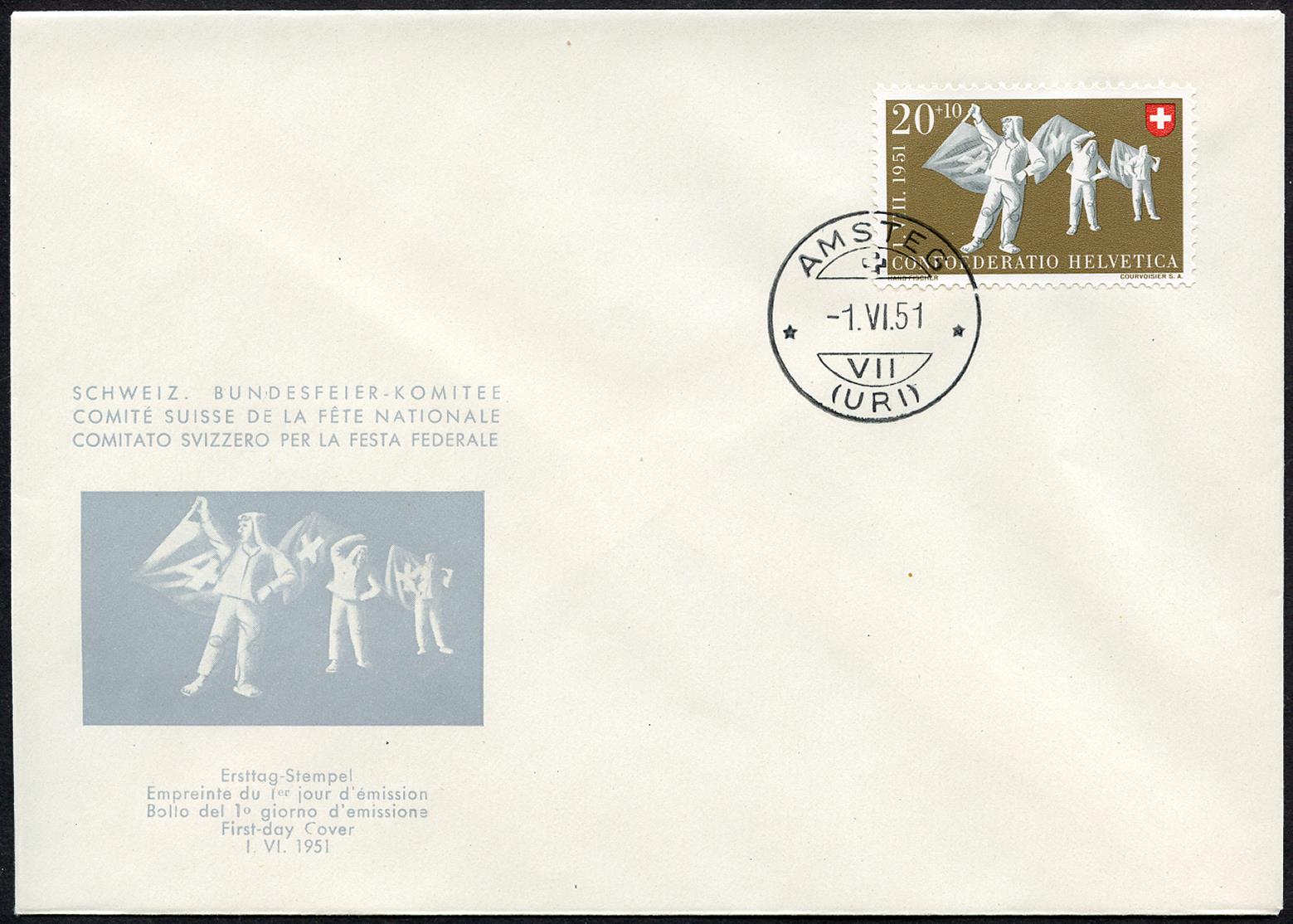 Francobollo del primo giorno di emissione ZÜRICH (FRAUMÜNSTER), CHAMPÉRY, AMSTEG, UTZENSDORF und BRÜNIG -1.VI.51