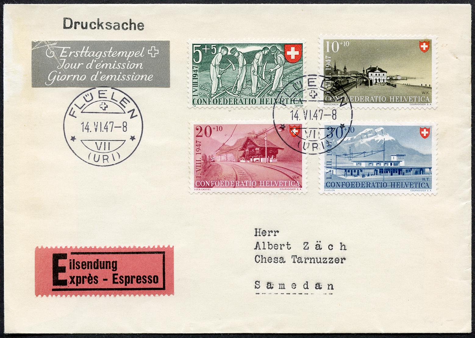 Echt gelaufener FDC, der mit Eilsendung von Flüelen nach Samedan befördert wurde. Die Markenserie ist farbenfrisch, allseits intakt gezähnt und sauber gestempelt und die Einheit ist in guter Erhaltung.