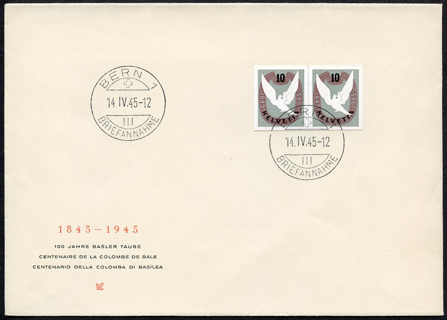 Francobollo del primo giorno di emissione BERN 1 14.IV.45-12 BRIEFANNAHME