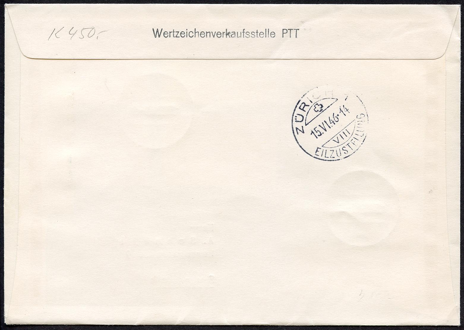 Una bellissima e piuttosto rara busta primo giorno di emissione, trasportata da Lutry a Zurigo. Timbro postale di arrivo sul retro. I francobolli commemorativi sono vivaci, con perforazione intatta e timbro postale ben visibile. L'intera serie è in ottime condizioni, praticamente impeccabile.