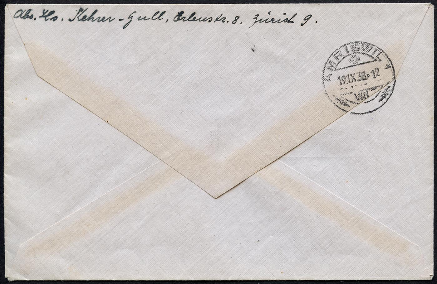 Farbenfrischer Blockausschnitt auf Einschreibebrief, der von Aarau nach Amriswil befördert wurde. Rückseite mit Ankunftstempel.