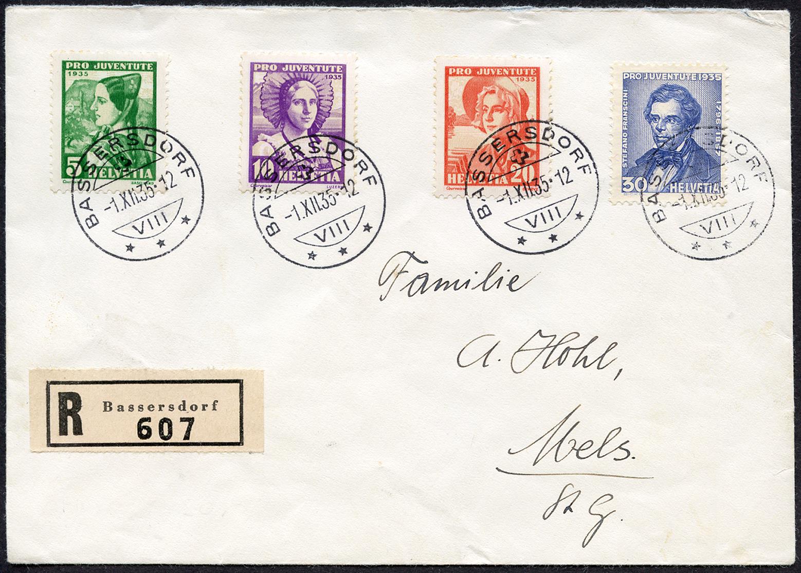 Una bellissima e soprattutto rara busta primo giorno di emissione, spedita come raccomandata da Bassersdorf a Mels (SG). I francobolli sono tutti intatti, perforati, applicati orizzontalmente e annullati in modo chiaro e nitido il primo giorno. L'intero esemplare è in buone condizioni.