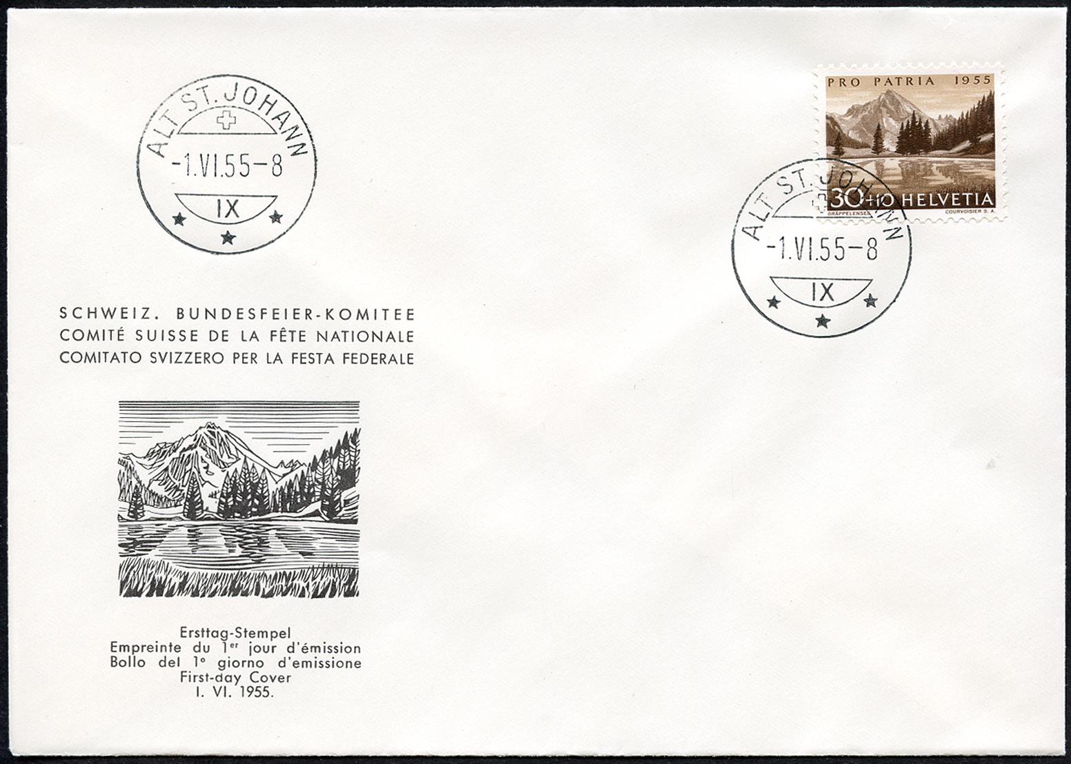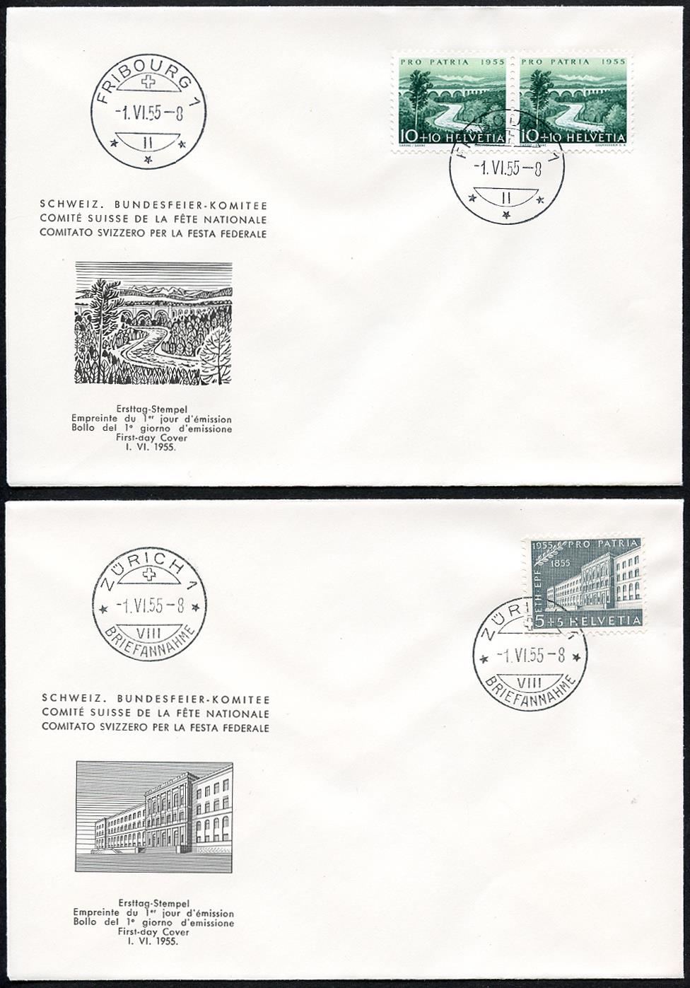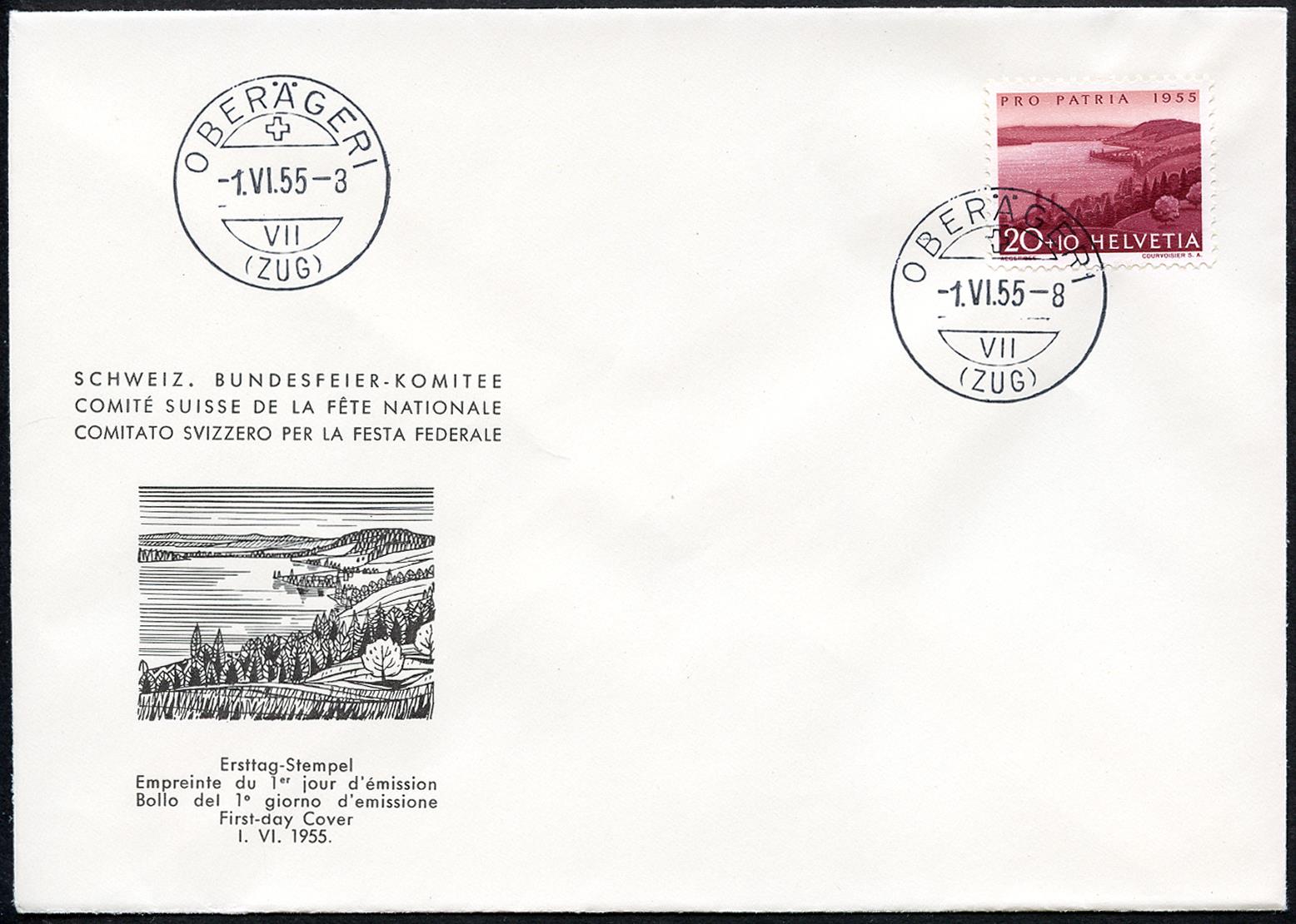Francobollo del primo giorno di emissione Zürich, Fribourg, Oberägeri, Alt St. Johann, Ligerz -1.VI.55