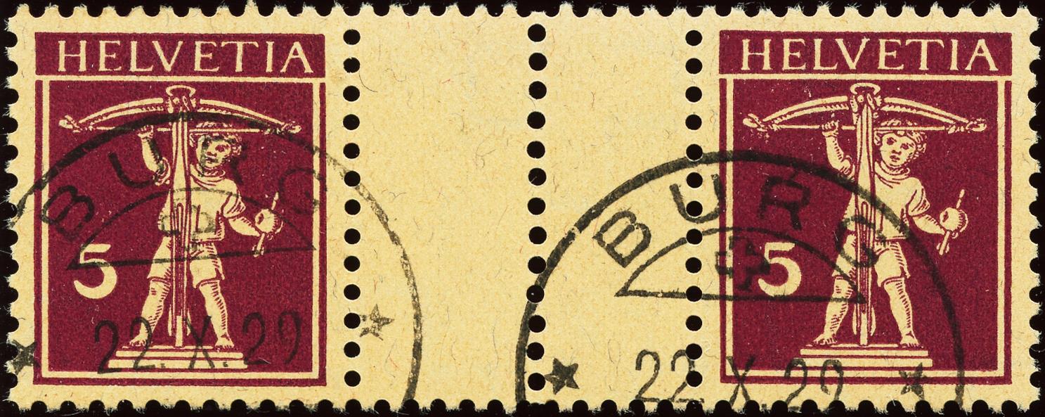 Ein farbfrischer Zwischensteg mit guter Zentrierung und intakter Zähnung. Die beiden Entwertungen sind gleichmässig und sauber aufgesetzt und das Stück befindet sich in einwandfreier Erhaltung.