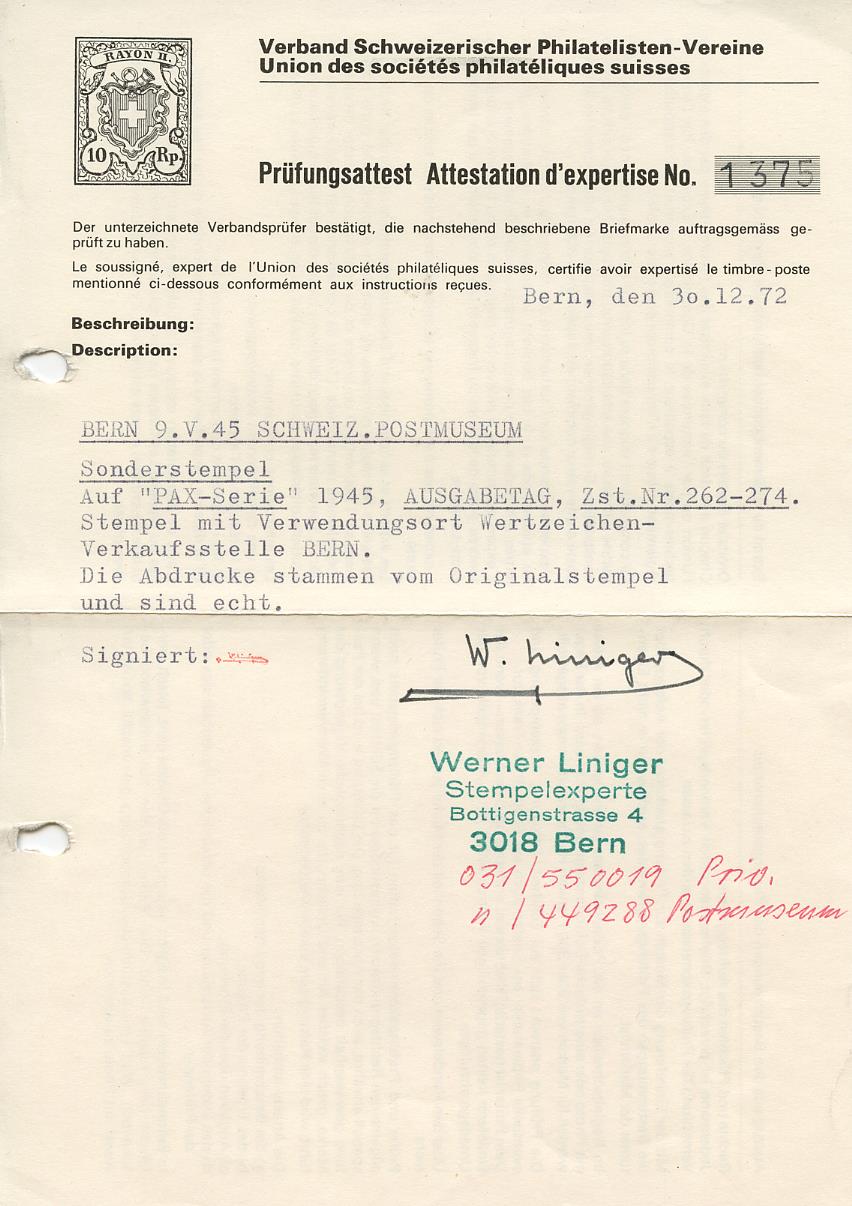 Ersttagsstempel BERN SCHWEIZ. POSTMUSEUM 9.V.45