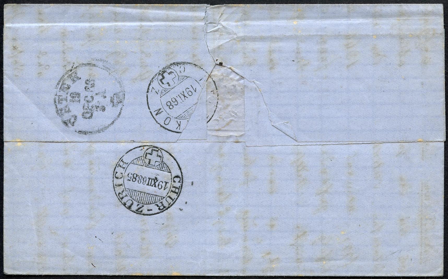This document was transported by charge from Greifensee to Pfäffikon. The stamp as well as the document is canceled with a delicate single-circle stamp. In the upper part a fold runs horizontally through the document and upper part of the stamp. With arrival stamp and date stamp Chur-Zürich on the reverse.