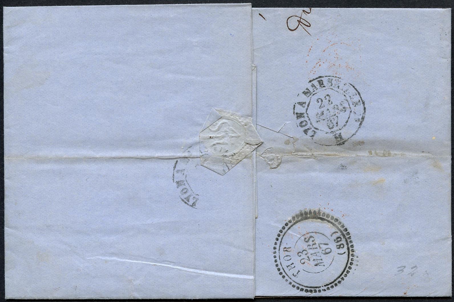 Ein schöner und sauberer Beleg, der von Basel nach Thor (F) befördert wurde. (Auf Rückseite mit Ankunftstempel). Die Marke ist farbfrisch und mit schwarzem Einkreisstempel von Basel entwertet. Die Zähnung ist auf der rechten Seite etwas unregelmässig. Ansonsten in guter und sauberer Erhaltung.