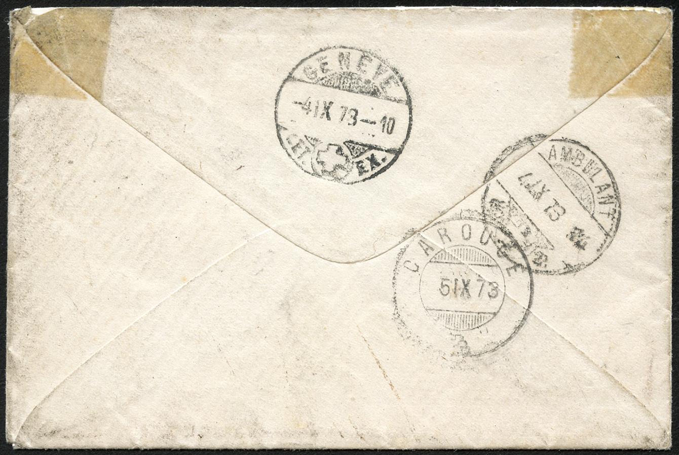 Dieser Brief wurde von Vuadens nach Carouge bei Genf befördert. Die Marke ist gut erhalten und mit gut lesbar entwertet. Auf der Rückseite sind die Ankuftstempel von Genève, Carouge und Ambulant^.